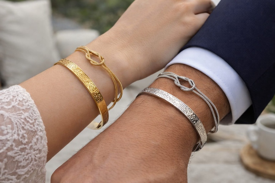 تتميز هذه الأساور بتصميم "الكفة" (Cuff) الكلاسيكي، وتأتي بلونين متضادين وجذابين: الذهبي اللامع والفضي المصقول.